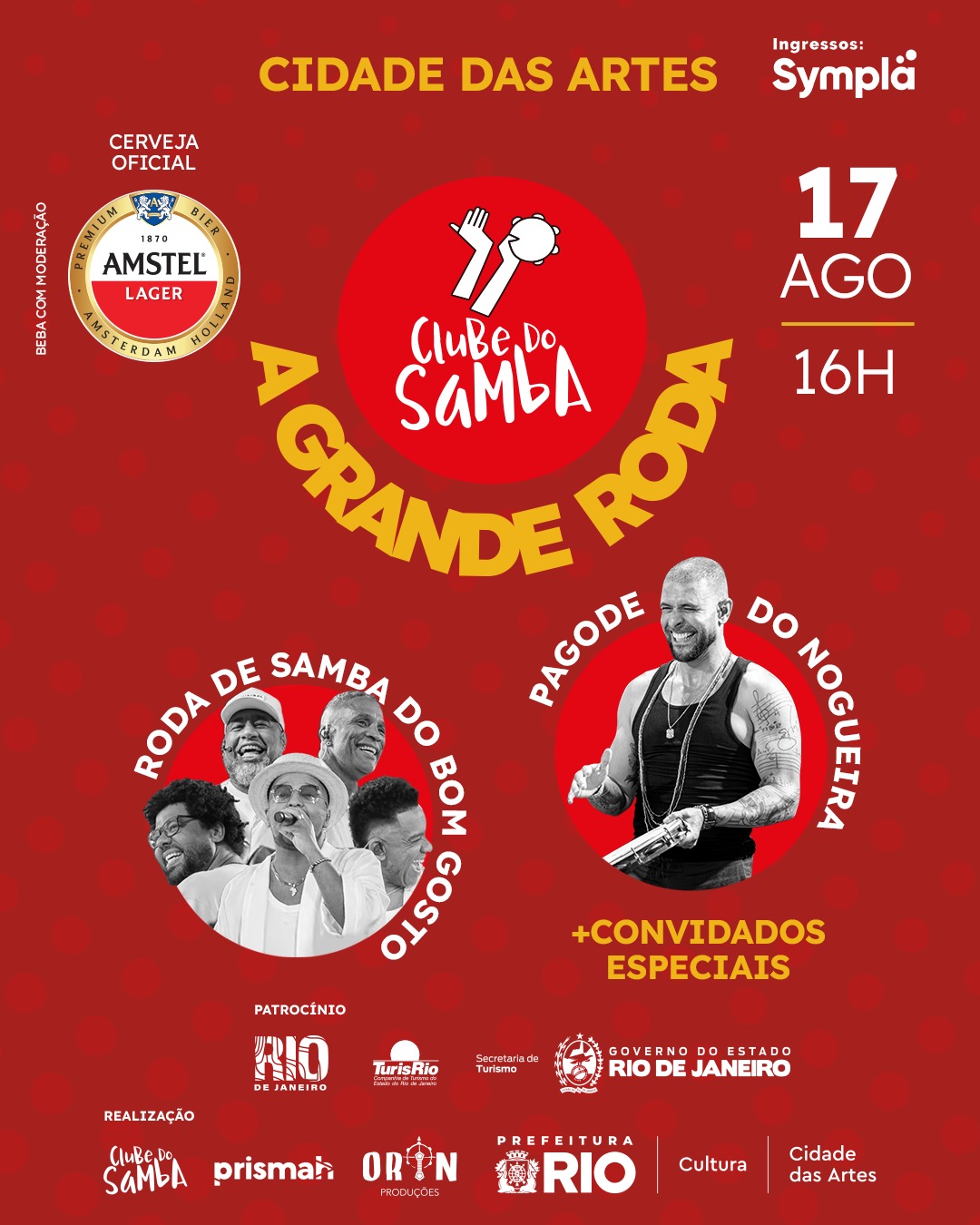 O Clube do Samba realiza no dia 17 de agosto (domingo), a partir das 16h, na Cidade das Artes, a segunda edição de A Grande Roda, evento que celebra o samba de raiz. Nesta edição, presta homenagem aos 25 anos sem João Nogueira. Entre as atrações, está a roda de samba “Pagode do Nogueira”, de Diogo Nogueira e uma roda de samba do grupo Bom Gosto, conhecido por sucessos como “Patricinha do Olho Azul”, “Jeito Carinhoso” e “Curtindo a Vida”.