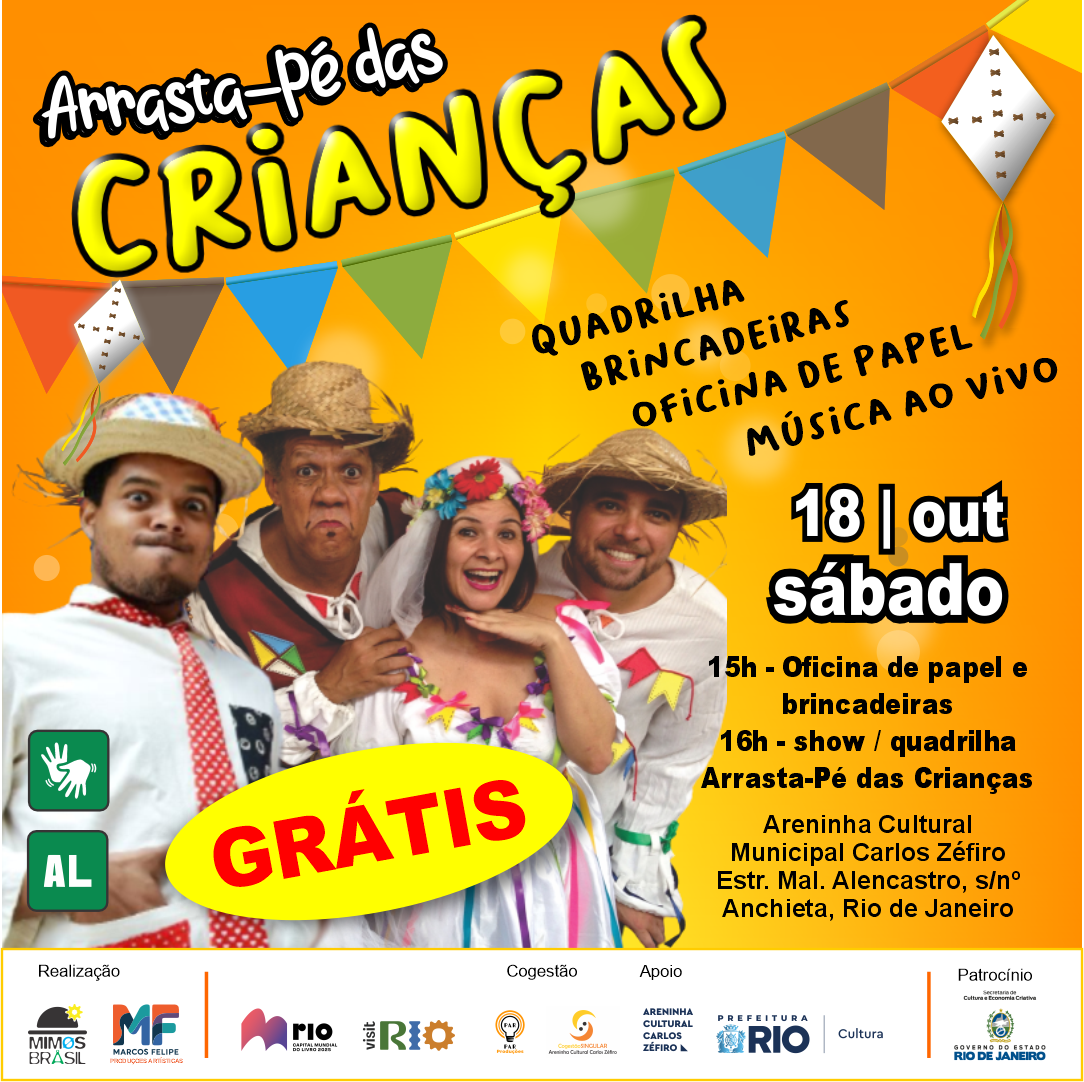 O Arrasta-pé das Crianças tem a realização da Mimos Brasil, selecionado no Edital Arraiá Cultural 2025 com patrocínio do Governo do Estado do Rio de Janeiro / Secretaria de Estado de Cultura e Economia Criativa do Rio de Janeiro. Tem o apoio da Secretaria Municipal de Cultura do Rio de Janeiro e da APAR. Coloque sua roupa de festa junina e venha se divertir com o Arrasta-Pé das Crianças!