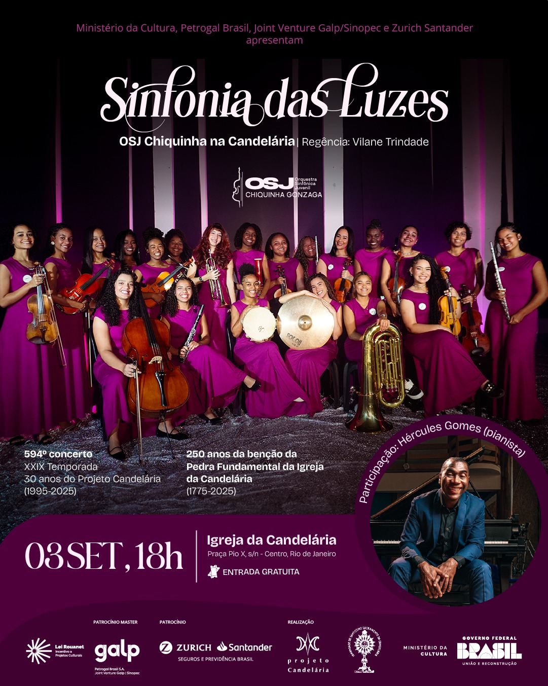 Patrimônio histórico, artístico e religioso do Rio de Janeiro, a Igreja de Nossa Senhora da Candelária, no Centro da cidade, é palco do concerto gratuito Sinfonia das Luzes, que a Orquestra Sinfônica Juvenil Chiquinha Gonzaga, formada exclusivamente por meninas, estudantes da rede pública de ensino, apresenta no dia 3 de setembro (quarta-feira), às 18h.