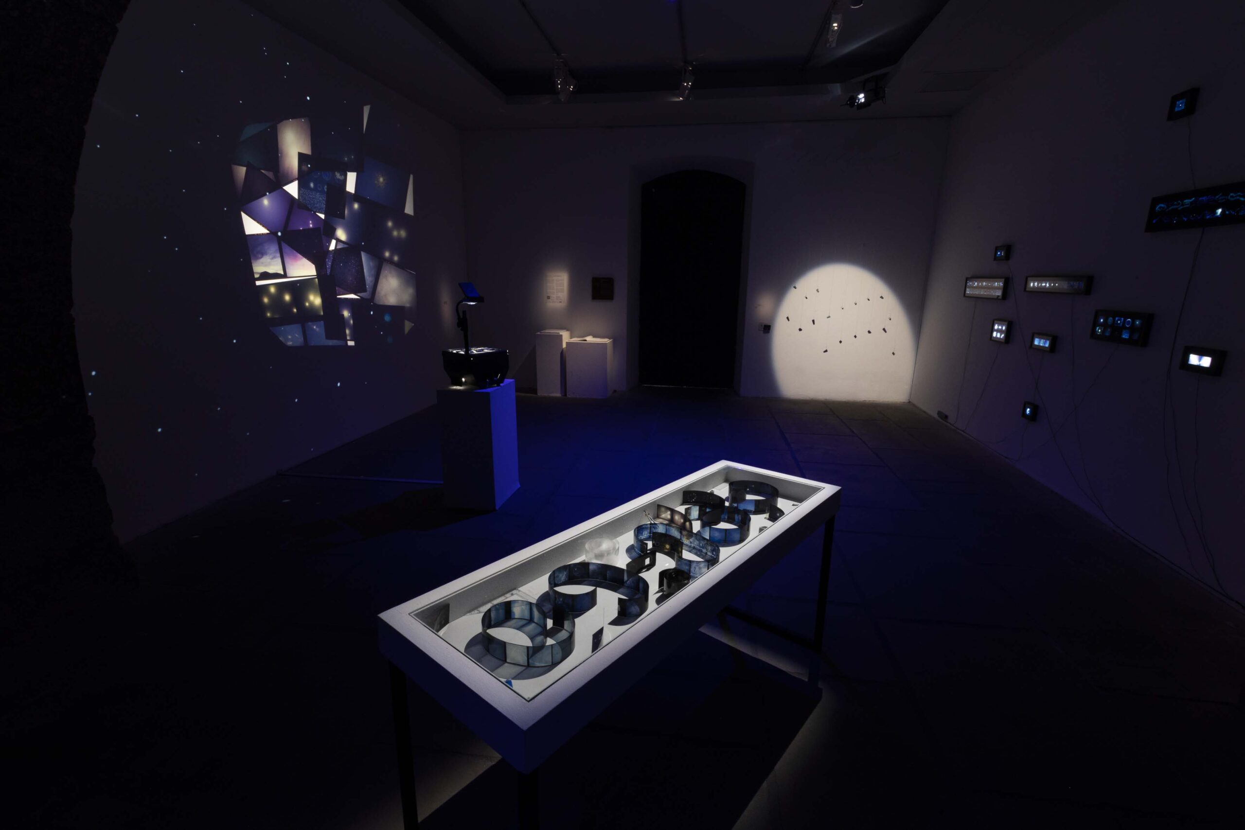 Essas imagens estão expostas de formas variadas. Muitas delas estão em caixas de luz, com fotogramas em sequências, que criam uma narrativa. Três fotogramas foram impressos em tamanho 64 x 80 cm. Há, ainda, um vídeo feito a partir de animações das obras da artista, levando o espectador a uma viagem pelo espaço. Completam a mostra imagens expostas em 10 dispositivos ópticos variados, como monóculos, lupas e retroprojetor.