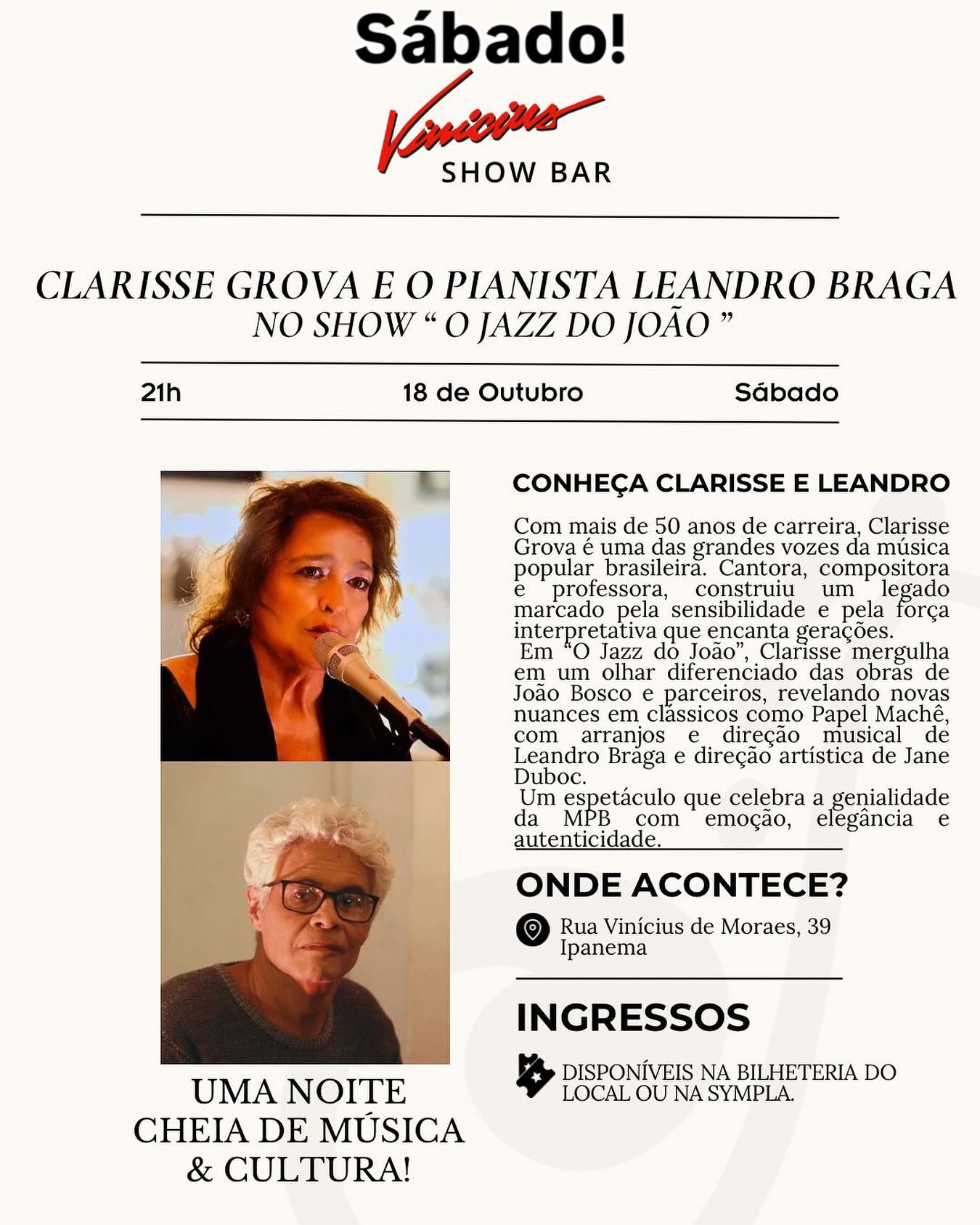 Dia 18/10 (sábado 21h) tem Show “O Jazz do JOÃO BOSCO” com a cantora CLARISSE GROVA e o pianista LEANDRO BRAGA no VINICIUS SHOW BAR de Ipanema.