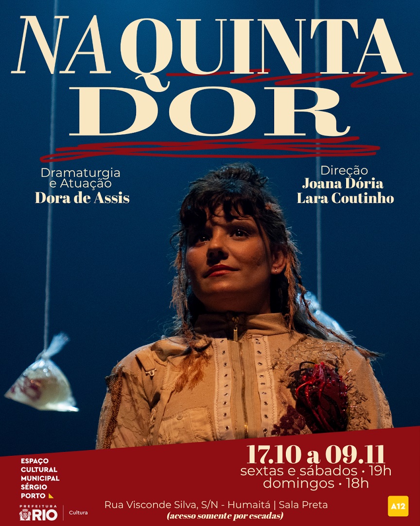Espetáculo: “Na Quinta Dor” Temporada: de 17 de outubro a 9 de novembro de 2025 Apresentações: sextas e sábados, às 19h, e domingo, às 18h Local: Espaço Cultural Municipal Sérgio Porto – Sala Preta Endereço: Rua Humaitá, 163 | Rua Visconde de Silva s/n Ingressos: R$ 60 (inteira) e R$ 30 (meia). Classificação indicativa: 12 anos. Duração: 90 min.