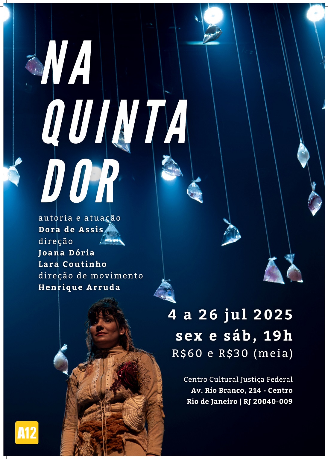 Espetáculo: “Na Quinta Dor” Temporada: de 4 a 26 de julho de 2025 Apresentações: sextas e sábados, às 19h Local: Centro Cultural da Justiça Federal – Av. Rio Branco, 241 – Centro. Tel.: (21) 3261-2550 Ingressos: R$ 60 (inteira) e R$30 (meia). Classificação indicativa: 12 anos. Duração: 90 min.
