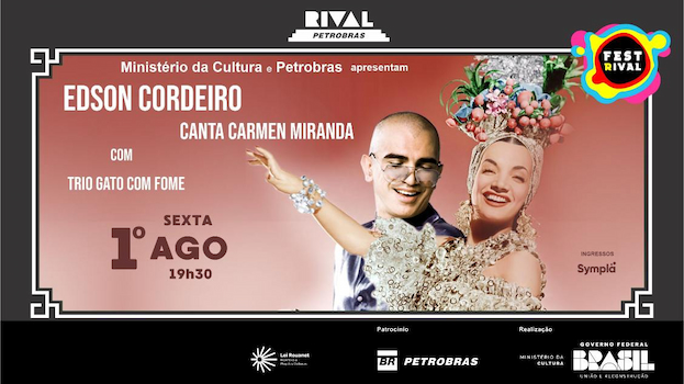 Curiosidade: Edson Cordeiro e Carmen Miranda nasceram no mesmo dia, 9 de fevereiro — ele em 1967 e ela em 1909. A apresentação conta com o acompanhamento do Trio Gato com Fome, formado por Cadu Ribeiro (pandeiro e voz), Gregory Andreas (cavaquinho e voz) e Renato Enoki (violão 7 cordas e voz), grupo dedicado à pesquisa do samba, além de possuir um trabalho autoral.