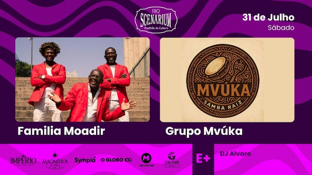 🕡 19:30h | Família Moadir – Usa todo seu carisma e criatividade para celebrar a majestosa arte do samba e suas vertentes. Apresentam um espetáculo que mistura clássicos de sambistas como Cartola, Nelson Cavaquinho, Roberto Ribeiro, Paulinho da Viola, entre outros ícones, com o melhor do samba atual, incluindo Zeca Pagodinho, Arlindo Cruz, Xande de Pilares e Dudu Nobre.