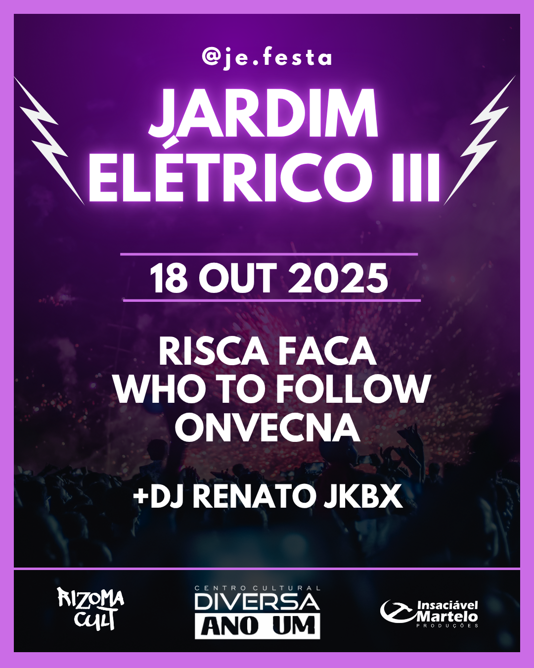 O Jardim Elétrico chega à sua terceira edição reunindo o melhor da cena alternativa carioca em uma noite dedicada à mistura de vertentes do rock, guitarras distorcidas e ritmos brasileiros. O evento acontece na Rua da Carioca, 54A, no Centro do Rio, e promete uma imersão sonora com três bandas e um DJ que movimenta o underground da cidade.