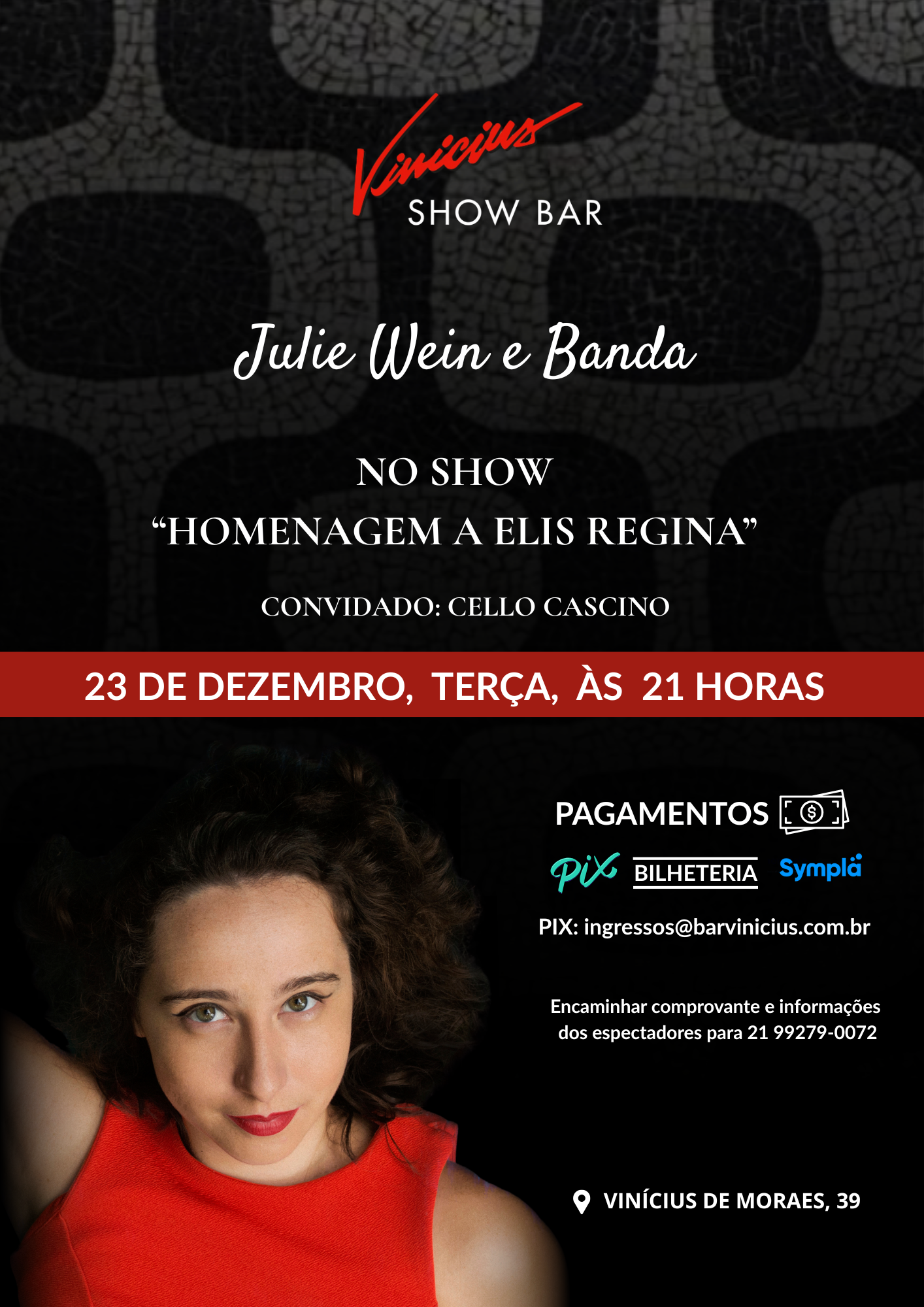 No piano e voz Julie Wein, no baixo acústico Rodrigo Villa, na bateria Paulo Diniz e o Convidado Cello Cascino no violão e voz. Venha apreciar essa noite aconchegante no Vinicius Show Bar se inicia as 21 horas na Rua Vinícius de Moraes, 39, Ipanema. Ingressos disponíveis na Bilheteria do Local, na Sympla e Pix.