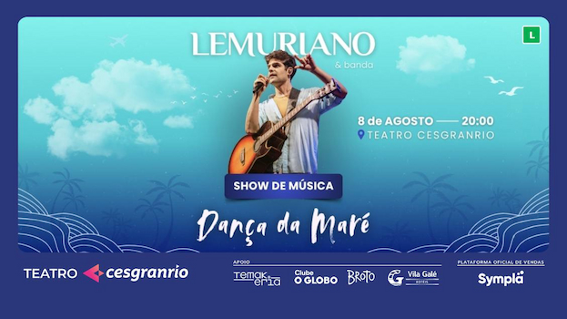 After a series of sold-out shows across the state of Rio in 2024, Lemuriano returns to the stage with his characteristic MPB/Rock style, full of figurative language, memorable original songs, and innovative covers of Brazilian classics. This time, the Cesgranrio Theater will host the debut of Dance of the Tide, featuring a repertoire of songs with beach-themed lyrics, which come together like chapters of a book, creating a light and flowing narrative of love, self-discovery, and belonging to nature — dilemmas that touch everyone’s life. The lyrics are based on the rhythm principle of hermeticism, which views life as the highs and lows of a tide, where the wise person is one who learns to master the waves.