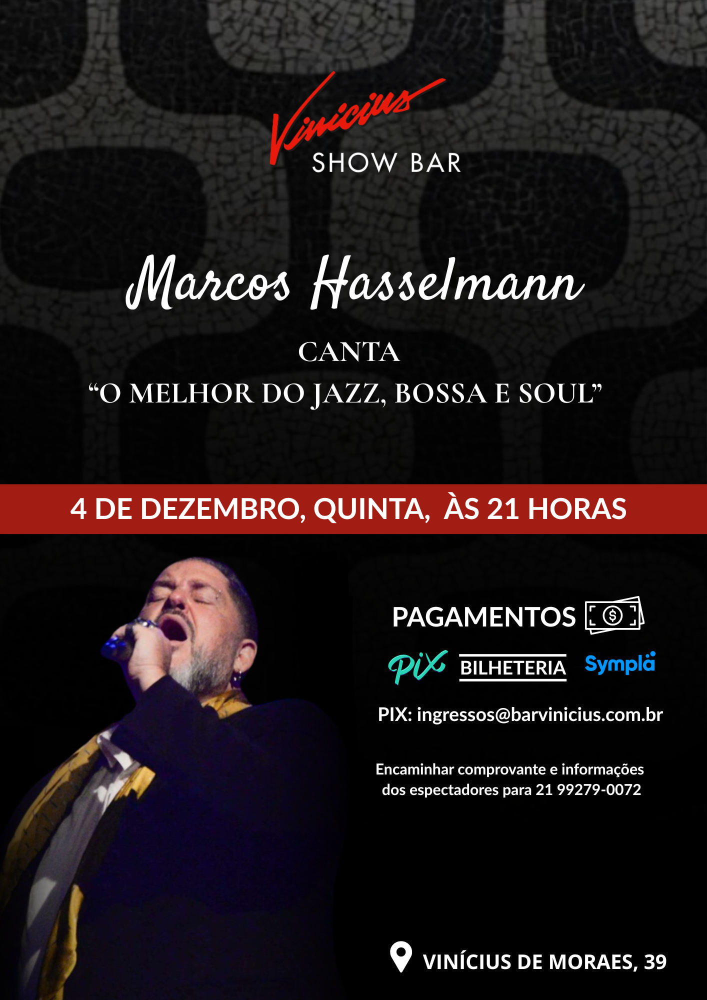 Dia 04 de dezembro quinta-feira as 21 horas o Vinicius Show bar apresenta Marcos Hasselmann Canta o melhor do Jazz, Bossa e Soul
