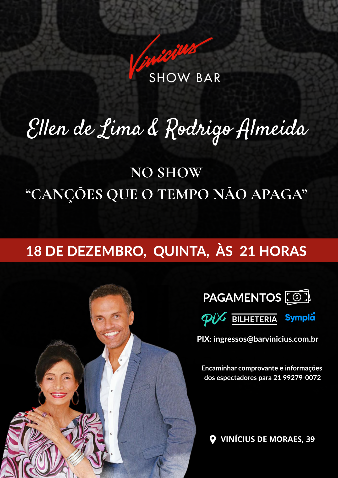 Ellen de Lima & Rodrigo Almeida – Canções que o Tempo Não Apaga No dia 18 de dezembro, o palco do Vinícius Piano Bar, na rua Vinícios de Morais 39, Ipanema, Ingressos disponíveis na Bilheteria do Local, na Sympla e Pix. Venha conferir este encontro especial e cheio de emoção.