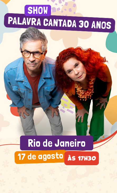 Há 30 anos, a Palavra Cantada encanta crianças e adultos com músicas que atravessam gerações. Para comemorar essa trajetória incrível, a dupla Sandra Peres e Paulo Tatit apresenta o espetáculo inédito “Palavra Cantada 30 anos”, no Rio de Janeiro!