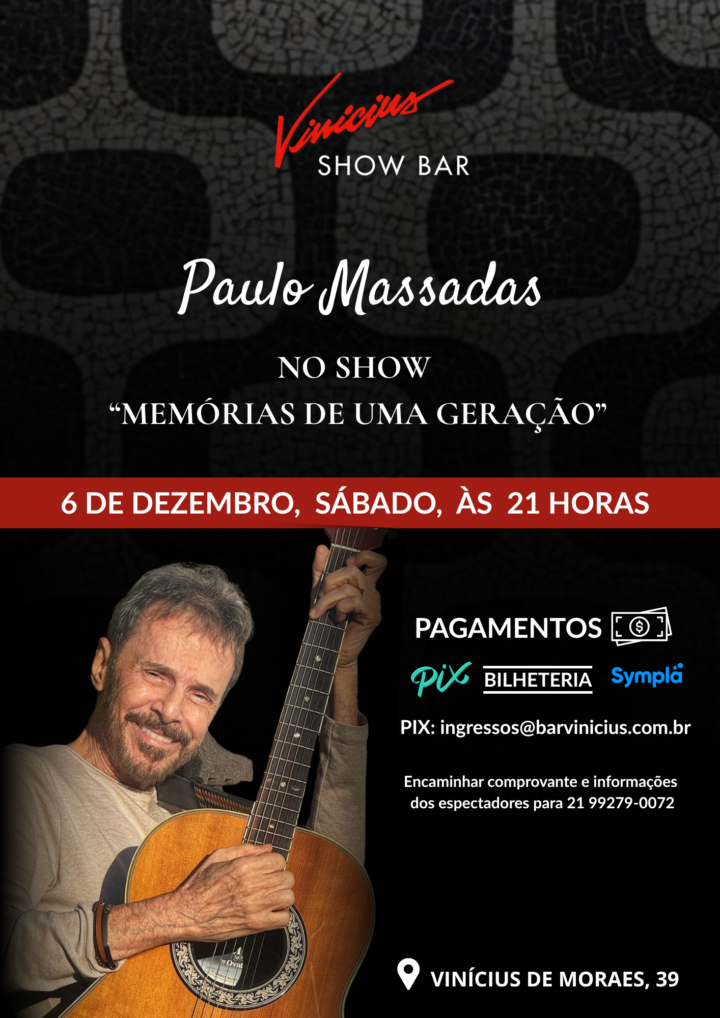 Dia 06 de dezembro sábado as 21 horas o Vinicius Show Bar apresenta Paulo Massadas no show ‘Memórias de uma Geração’