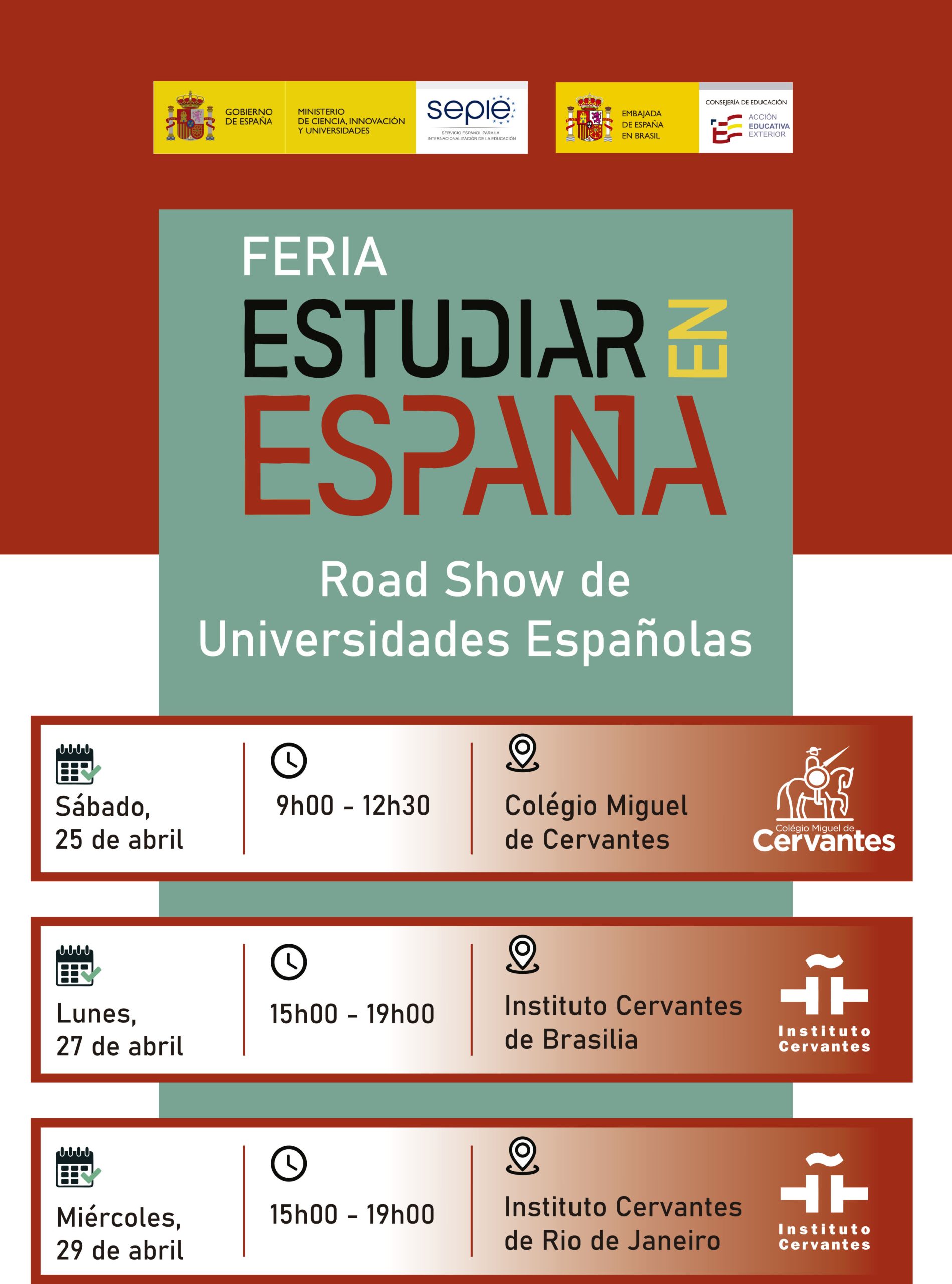 No dia 29 abril, quarta-feira, o Instituto Cervantes do Rio de Janeiro sediará o evento Road Show de Universidades Espanholas. Organizado pelo SEPIE, como agência nacional do programa Erasmus+ e da internacionalização, juntamente com o Escritório de Educação da Embaixada da Espanha e o Instituto Cervantes, o evento inclui tanto um seminário de contatos quanto uma feira de atração de talentos. A inauguração oficial será das 10h às 10h30, seguida de sessões de networking até às 13h e feira (das 15h às 19h).