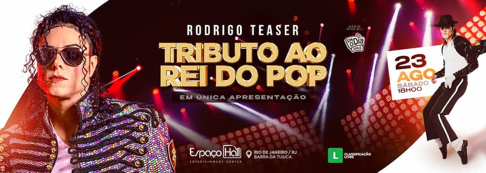 Relembrando grandes sucessos como “Thriller”, “Billie Jean”, “Smooth Criminal” e muitos outros, o cantor Rodrigo Teaser irá se apresentar no Espaço Hall com o espetáculo Tributo ao Rei do Pop, Michael Jackson. O show acontecerá no dia 23 de agosto, às 18h.