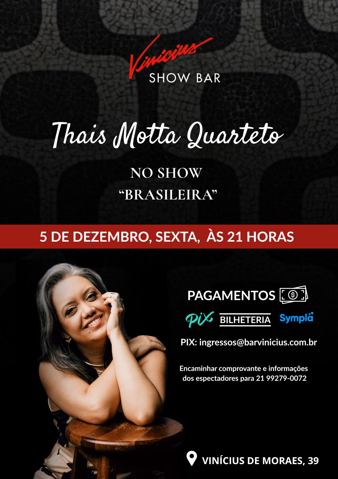 No dia cinco de dezembro Thais Motta leva ao palco do Vinicius Show Bar uma noite de Brazilian Jazz – música brasileira com seleção especial do repertório da cantora, proporcionando ao ouvinte uma experiência musical aditivada de um conceito jazzístico, com harmonias sofisticadas e liberdade artística sempre presente. No repertório, canções como, Estrada do Sol (Tom Jobim e Dolores Duran), Pedro Brasil (Djavan), Azul (Djavan), Aquarela do Brasil e Isso aqui o que é (Ary Barroso), entre outras. Em destaque a cuíca vocal inusitada que Thaís faz com perfeição e arranjos super especiais elaborados para este concerto, que com certeza, será inesquecível! A banda formada por: Thaís Motta na voz, Mauricio Piassarollo no teclado, Jefferson Lescowich no baixo e Wallace Santos na bateria. Sua noite especial começa às 21 horas na Rua Vinícius de Moraes, 39, Ipanema. Ingressos disponíveis na Bilheteria do Local, na Sympla e Pix.